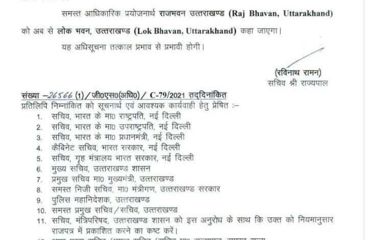 गृह मंत्रालय भारत सरकार के पत्र संख्या 7/10/2025 (Part)-M&G 25 नवम्बर, 2025 तथा राज्यपाल, उत्तराखण्ड की स्वीकृति के क्रम में देहरादून तथा नैनीताल स्थित “Raj Bhavan” “राजभवन” का नाम अधिकारिक रूप से ‘Lok Bhavan” “लोक भवन” किया जाता है।