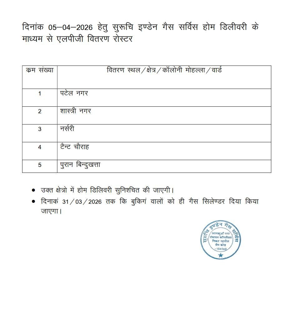 क्षेत्रवासियों के लिए राहत भरी खबर है। निर्धारित रोस्टर के अनुसार रविवार को भी एलपीजी गैस का वितरण किया जाएगा। खाद्य पूर्ति निरीक्षक मोहित कठायत ने जानकारी देते हुए बताया कि दिनांक 05 अप्रैल 2026 को सुरूचि इंडेन गैस सर्विस द्वारा होम डिलीवरी के माध्यम से विभिन्न क्षेत्रों में गैस सिलेंडर वितरित किए जाएंगे।