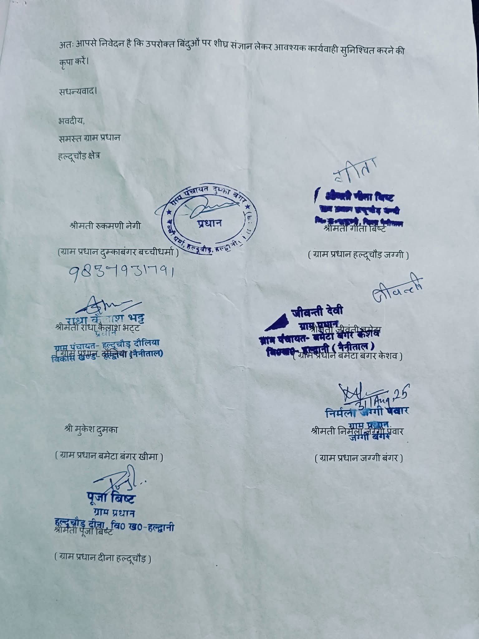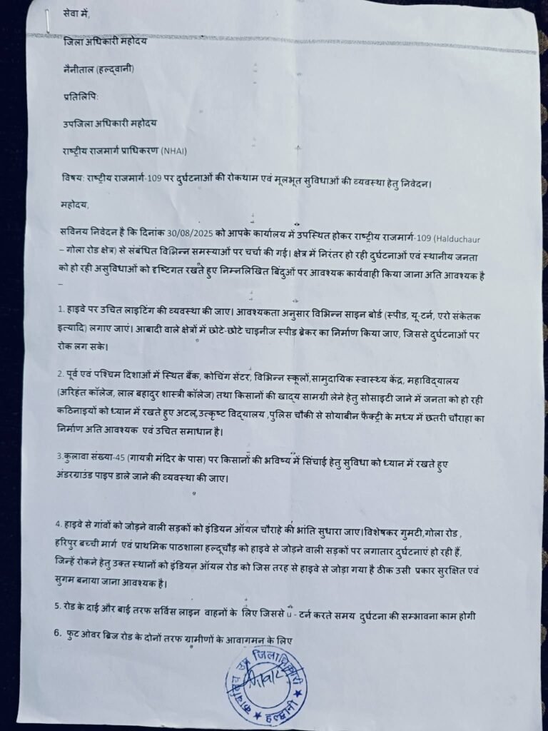 हल्दूचौड़ में बढ़ती दुर्घटनाओं पर ग्राम प्रधान का बड़ा कदम — जिलाधिकारी को सौंपा ज्ञापन, छतरी चौराहा निर्माण की उठाई मांग।